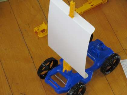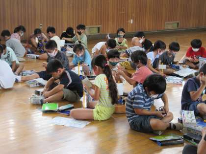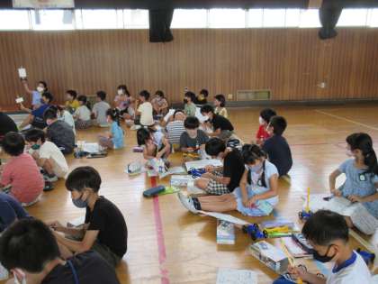 3年生の理科の学習の様子です。「風やゴムの力で走る車」の実験を講堂で行っています。