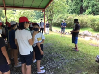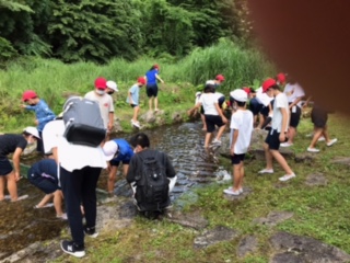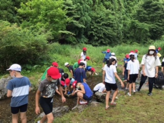 つかみ方のコツなどを聞いて川に入り魚のつかみ取りです。