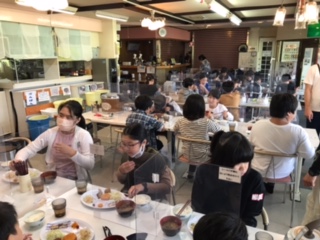 ?みんな揃って朝食の時間です。しっかり食べて一日頑張りましょう。