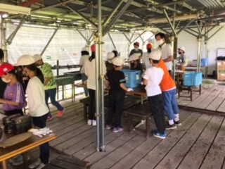 ? 山登りでお腹もすきました。今から2班ごとにカレー作りに挑戦です。まず作り方や注意を聞いてはじめます。
