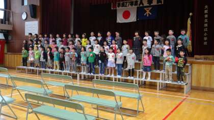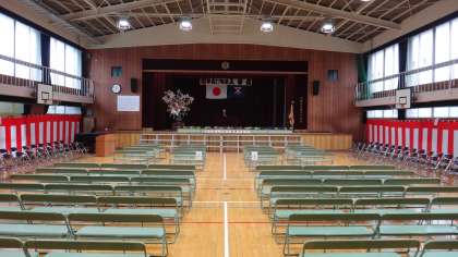 7日の入学式の準備を行いました。新6年生も登校し、教職員の手伝いをしました。式場の用意ができた後、新2年生のお迎えの演技の練習も行いました。