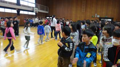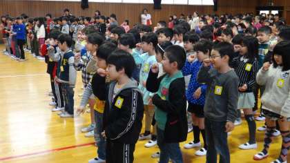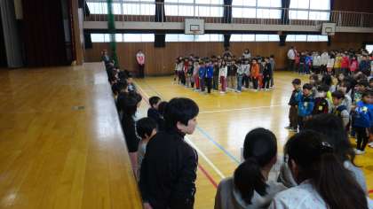 対面式が講堂で朝の会の時間にありました。緊張しながら1年生が講堂に入場すると2年生から6年生の温かい拍手がおこりました。児童会の進行で会が進みました。最後に全員で「えがお いっぱい ふかえっこ」の歌を歌いました。