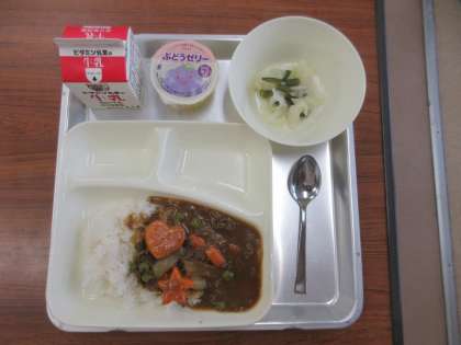 献立:ビーフカレーライス(ごはん)[米粉]、野菜のピクルス、ぶどうゼリー、牛乳