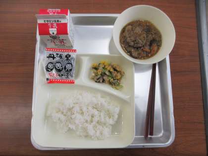 献立:マーボーなす、ツナとチンゲンサイのいためもの、いり黒豆、ごはん、牛乳