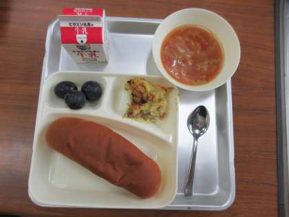 献立:豆乳マカロニグラタン[米粉]、トマトスープ、ぶどう(巨峰)、パン、牛乳