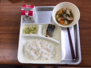 献立:さごしの塩焼き、豚肉とじゃがいもの煮もの、キャベツの梅風味、ごはん、牛乳