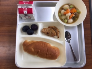 献立:あげぎょうざ、中華煮、ぶどう(巨峰)、パン、牛乳