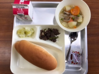 献立:牛肉の香味焼き、スープ煮、サワーキャベツ、パン、いちごジャム、牛乳