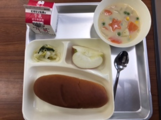 献立:コーンクリームシチュー[米粉]、はくさいのピクルス、りんご、パン、牛乳