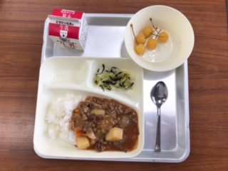 献立:ハヤシライス[米粉](ごはん)、キャベツのひじきドレッシング、さくらんぼ(缶)、牛乳