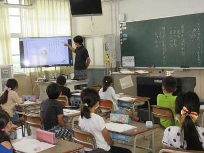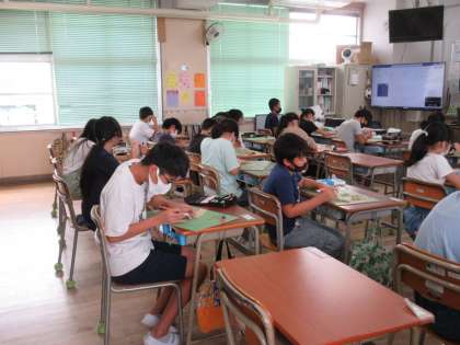 2年生の国語、6年生の図工の学習の様子です。6年生は版画の制作に取り組んでいます。