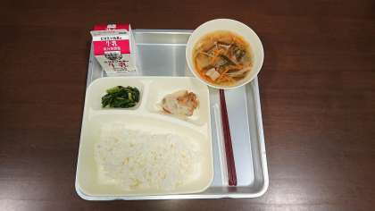 献立:鶏肉のゆず塩焼き,ソーキ汁,ほうれんそうのおひたしごはん,牛乳