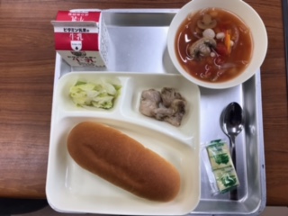 献立:鶏肉の香草焼き、ウインナーとてぼ豆のスープ、キャベツのガーリックソテー、パン、ソフトマーガリン、牛乳