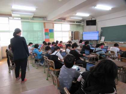 4年生の学習の様子です。今日は「スカイメニュークラウド」の使い方を担任の先生とICT支援員さんと一緒に練習しています。
