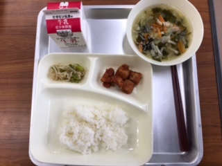 献立:まぐろのオーロラ煮、すまし汁、もやしとピーマンのいためもの、ごはん、牛乳