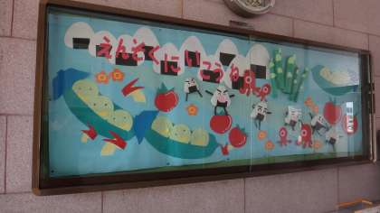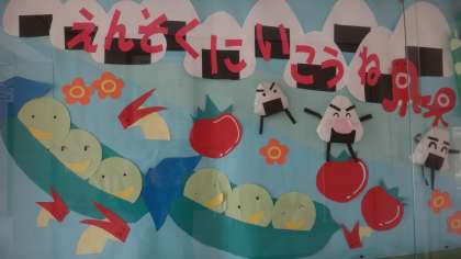 5月の玄関掲示は遠足仕様です。連休明けに各学年遠足があります。校外に出て、いろいろな物を見たり、体験したりして豊かな感性を養ってほしいと思います。また、友達との仲間作りもしっかりとしてほしいと思います。
