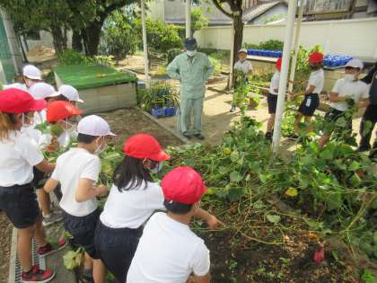 2年生の生活科の「おいもほり」の様子です。まず、お話を聞いてみんなで畑のお芋を掘り出します。