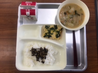 献立:千草焼き、みそ汁、ごまひじき、ごはん、牛乳