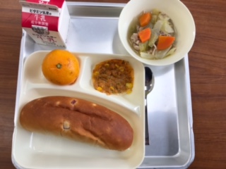 献立:豚肉と野菜のスープ煮、変わりピザ、みかん、パン、牛乳