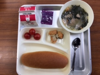 献立:さけのマリネ、肉だんごと麦のスープ、プチトマト、パン、ブルーベリージャム、牛乳