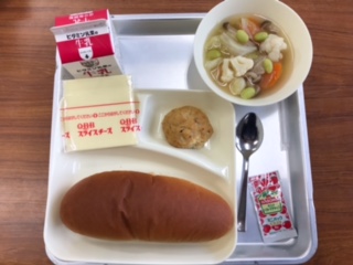 献立:とうふハンバーグ、カリフラワーのスープ煮、スライスチーズ、パン、牛乳
