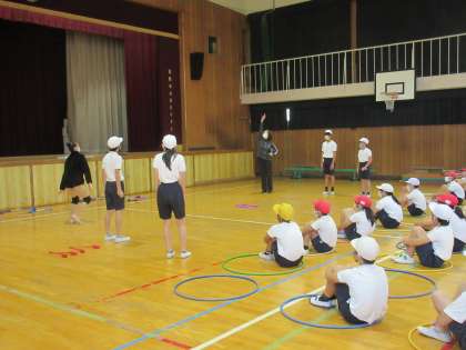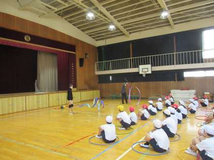 新体操で使われる5つの用具を説明していただき、代表が体験もさせていただきました。