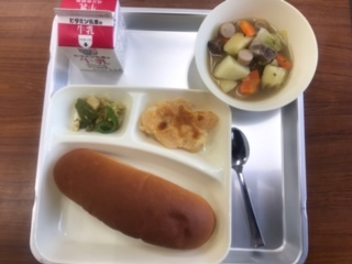 献立:ポトフ、カレーソテー、桃のクラフティ、パン、牛乳