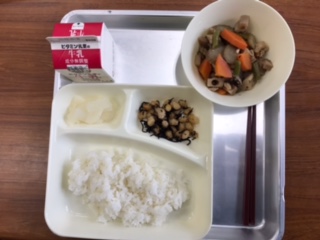 献立:筑前煮、ひじき豆、だいこんのゆず風味、ごはん、牛乳