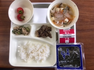 献立:手巻きごはん(牛肉の甘辛煮、ツナソテー)、すまし汁、いちご、牛乳