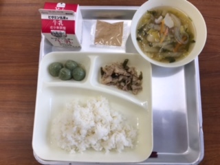 献立:豚肉とれんこんのいため煮、五目汁、きな粉よもぎたんご、ごはん、牛乳