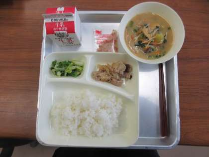 献立:豚肉のしょうが焼き、さつまいものみそ汁、なのはなのおひたし、ごはん、牛乳