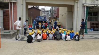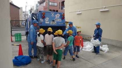 6月2日に、4年生がごみ分別体験をしました。学校へ環境事業局の方に来ていただき学習しました。パッカー車に廃棄物を入れる体験をし、運転席に乗る体験もしました。そのあと、ごみ分別体験もしました。環境を考える社会科の学習ができました。