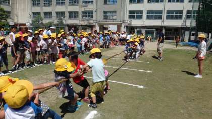 2日から深江小学校恒例の縦割り班対抗つなひき大会が行われています。全12班がトーナメント形式で15分休みと昼休みに行っています。1年生から6年生まで縦割班一体となって力いっぱい綱を引きます。運動場は子どもたちの歓声が響いています。
