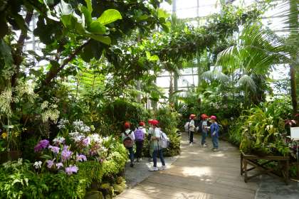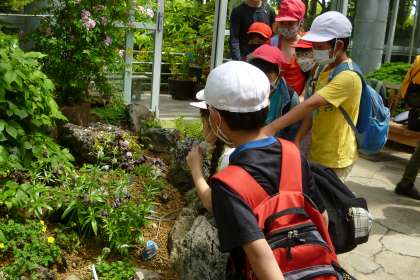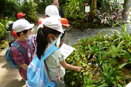咲くやこの花館では、グループに分かれ、いろいろな植物を見て回りました。クロユリの花のにおいを確かめている姿もたくさんありました。
