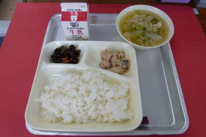 献立:さけのごまみそ焼き 五目汁 ひじきのいため煮、ごはん、牛乳