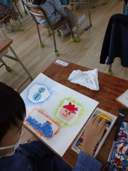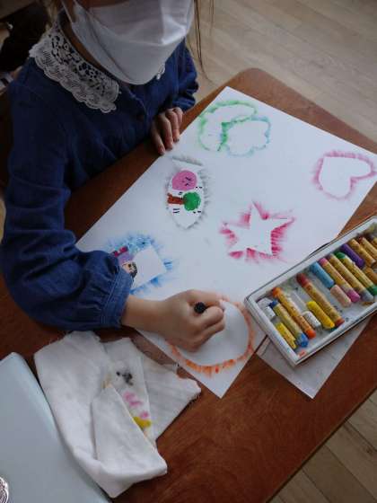 画用紙から自分の好きな形を切り取り、いろいろな色を塗って指でこすりだします。