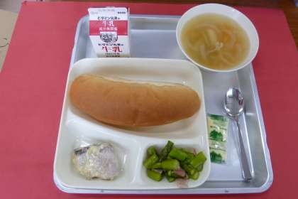 献立:かつおのガーリックマヨネーズ焼き、スープ、グリーンアスパラガスとベーコンのソテー、パン、牛乳