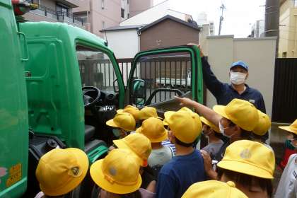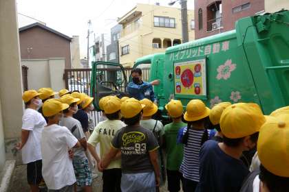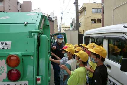 パッカー車を間近で見せていただき、気になることなどを質問したり、ごみ収集時の音楽をかけてもらい、何の収集時の音楽なのかを思い出してクイズのように楽しんで答えていました。「そうそう、この音楽!」「あっ、これは資源ごみ!」「あれ?ちゃうかったか。」など、あちこちから聞こえてきました。