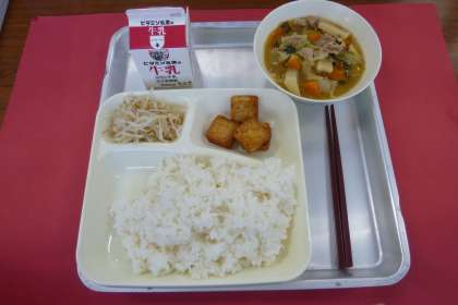 今日の献立は、中華煮、あつあげのピリ辛じょうゆかけ、もやしの中華あえ、ごはん、牛乳です。