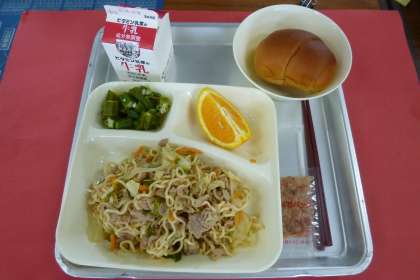 今日の献立は、和風焼きそば、オクラの甘酢あえ、オレンジ、黒糖パン(1/2)、牛乳です。