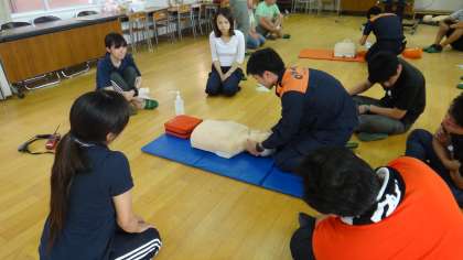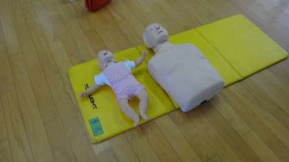 17日、東成消防署の方に来ていただき救急救命講習を行いました。教職員と希望された保護者の方が熱心に消防署員の方の話を聞き実技も行いました。今年は毎年行っている成人の模型のほか児童や幼児の模型もありました。
