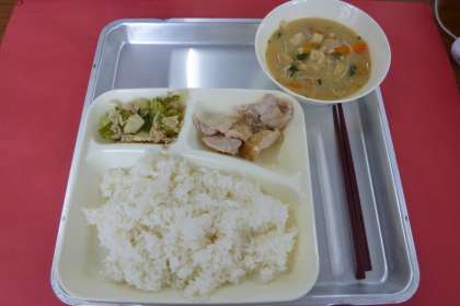 今日の献立は、鶏肉のおろしじょうゆかけ、みそ汁、野菜いため、ごはん、牛乳です。