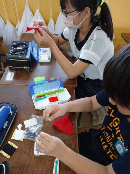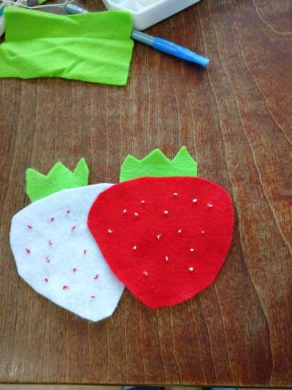 家庭科の時間に学習した「玉結び」と「玉止め」を作って、いちごをつくりました。とってもかわいいいちごができました。