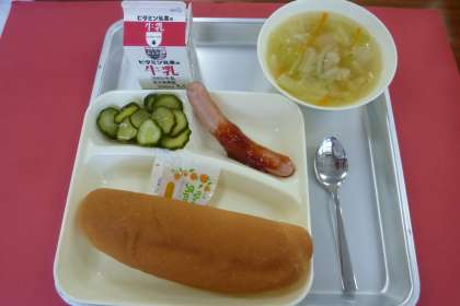 家で食べるウインナーよりも、長細いウインナー。コッペパンにケチャップをつけて、ウインナーをはさんで食べている子どももいました。スープは、にんじん、たまねぎ、キャベツなどの野菜もたっぷり入っていて、食べごたえのある給食でした。
