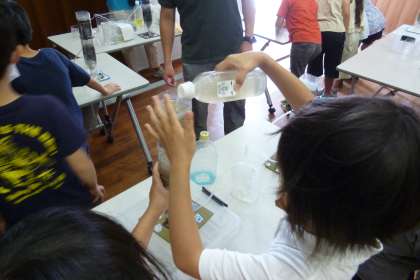 きれいになった水は、200以上の検査にクリアして、初めて配水されます。この広い芝生の下に水が貯水されているそうです。災害時などに出動する給水車も実際に見せてもらい見学を終了。会議室に戻って、砂や、活性炭の入ったペットボトルを使って、水のろ過の実験をしました。濁った水がきれいになり、においもとれることを実験を通してより深く学ぶことができました。