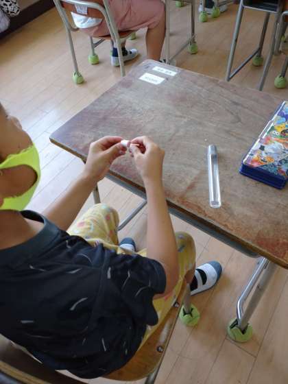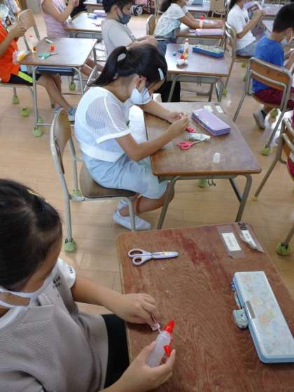 紙テープをつまようじにクルクルと巻いて、コマを作りました。