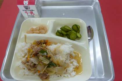 今日の献立は、牛丼(ごはん)、きゅうりのしょうがづけ、大福豆の煮もの、牛乳です。