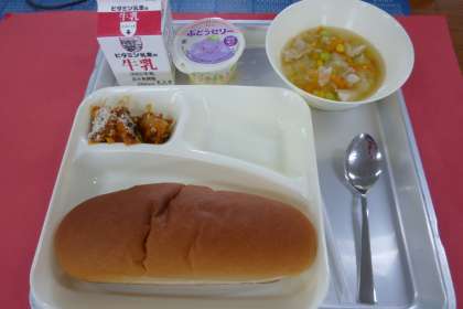 今日の献立は、かぼちゃのミートグラタン、スープ、ぶどうゼリー、黒糖パン、牛乳です。
