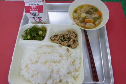 今日の献立は、豚肉とじゃがいもの煮もの、オクラの梅風味、ツナっ葉いため、ごはん、牛乳です。