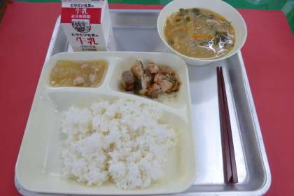 今日の献立は、さけのつけ焼き、みそ汁、とうがんの煮もの、ごはん、牛乳です。